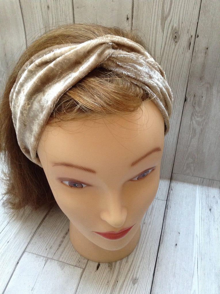 Have the perfect winter 1940s vintage style accessory in this handmade champagne gold coloured, crushed velvet twisty turban band. As the days become cooler, why not keep your head and ears as warm as toast with this glamorous velour, twisty turban headband.
