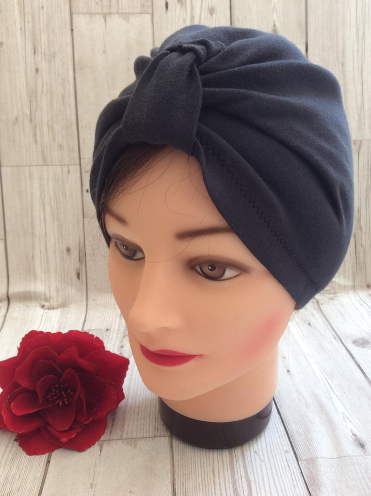 The turban is made in soft, stretch 100% cotton jersey. It has been made to fit an average sized lady's head but will stretch to fit. The turban has a fabric tab to gather the fabric at the front and is pleated at the back and pulls on easily without any fiddly tying.