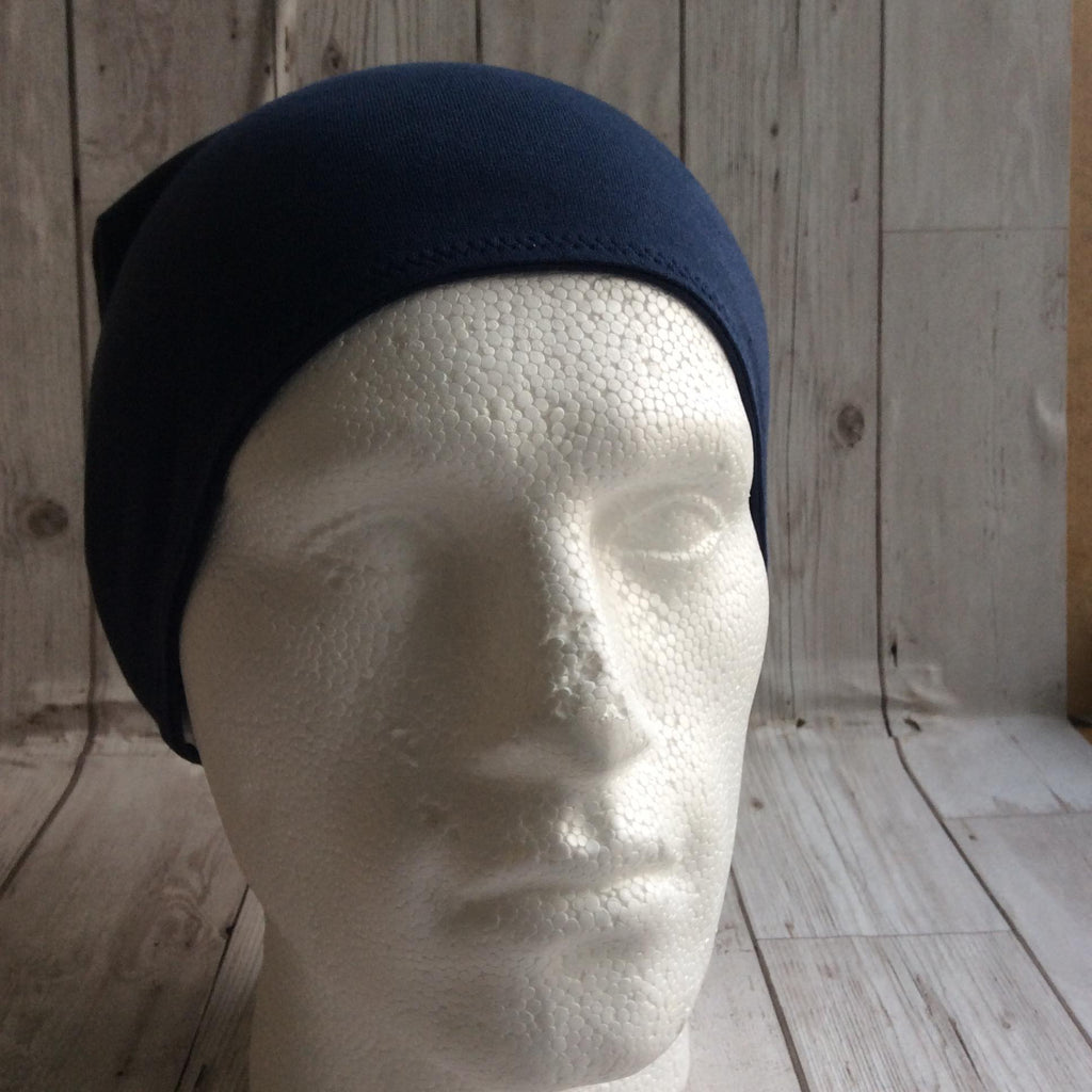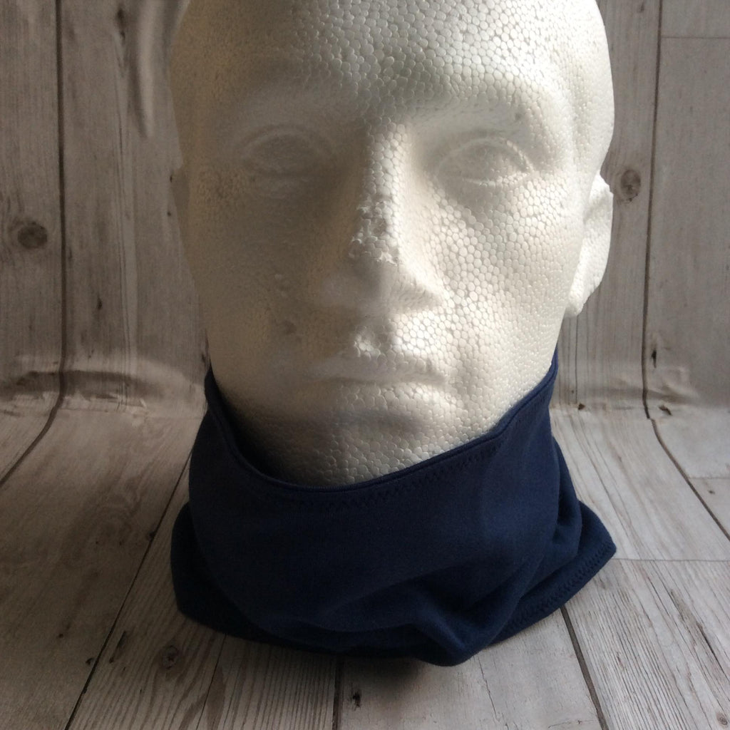 This double layered tubular neck scarf, made in a plain cotton lycra fabric, can be worn pulled over the head as a slouchy beanie or a bandana, pulled up over the nose and mouth as a masculine face covering in cold weather especially for skiing, or worn around the neck for warmth.