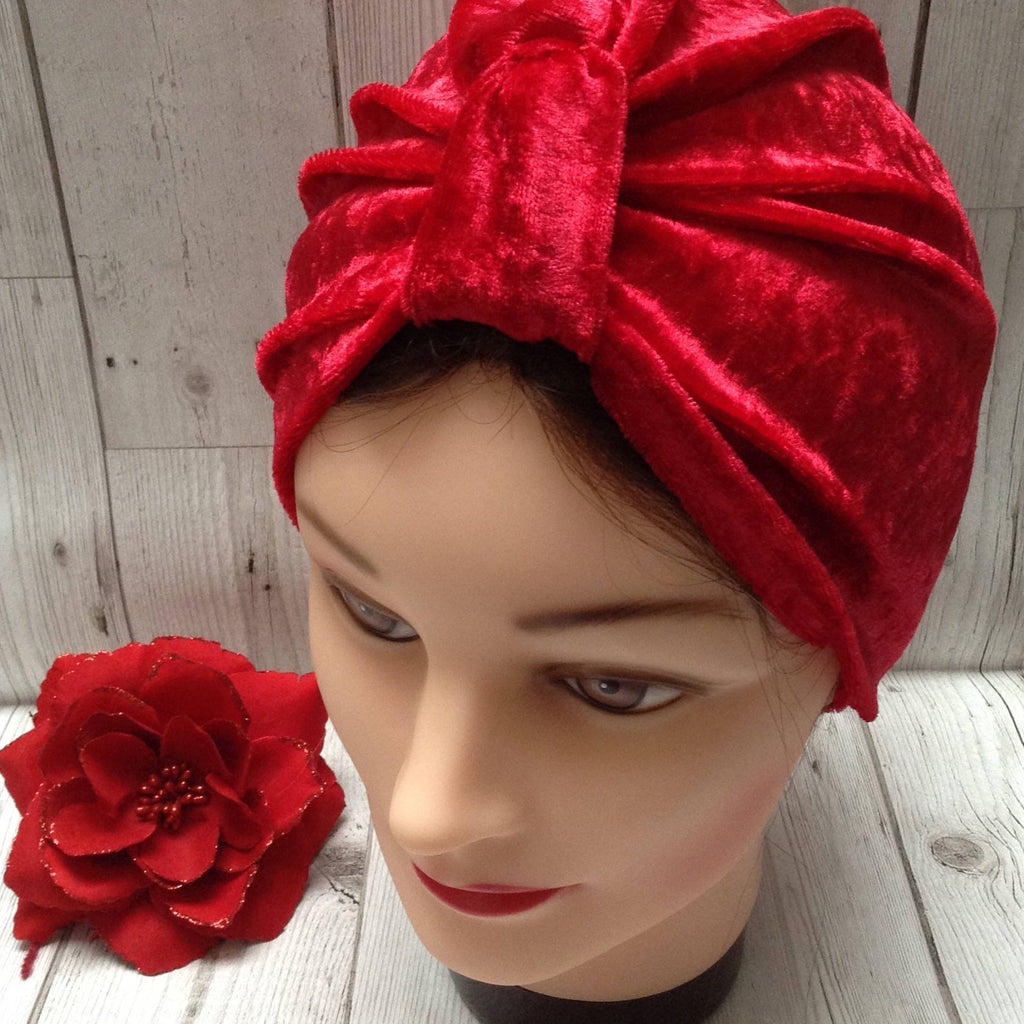The turban is made in soft, red stretch velvet. It has been made to fit an average sized lady's head but will stretch to fit. The turban has a fabric tab to gather the fabric at the front and is pleated at the back and pulls on easily without any fiddly tying.