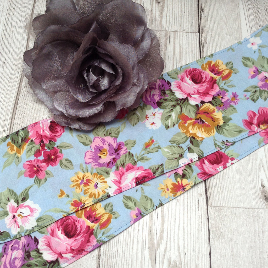 It has bouquets of pink roses and yellow flowers scattered over a sky blue background and finished with top stitching.